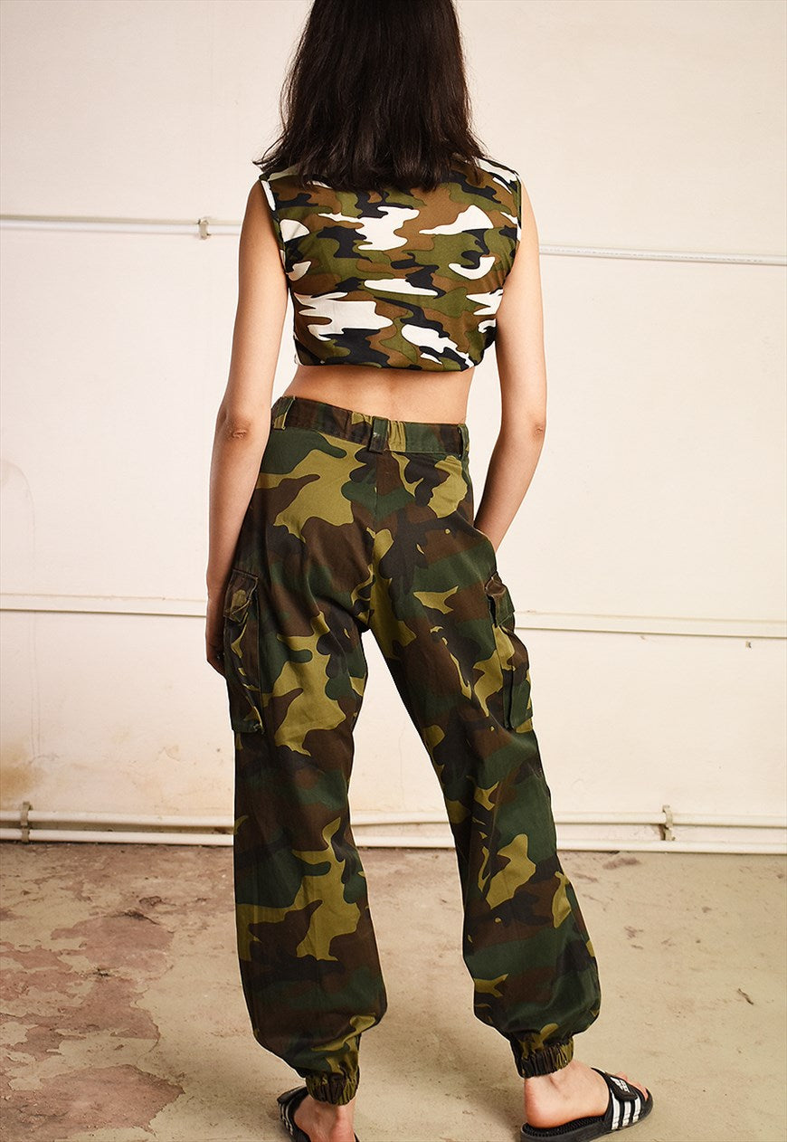 Cool Y2K retro camo cargo military festival trousers. Zipped, button, belt loops, gathered bottoms, pockets, great condition. Size fits 27 W 27L. Please see the measurements. The model size is UK 6. Waist - 70 cm, inside leg length - 83 cm. Delicate wash. Browse our full collection for other matching items. TR 457