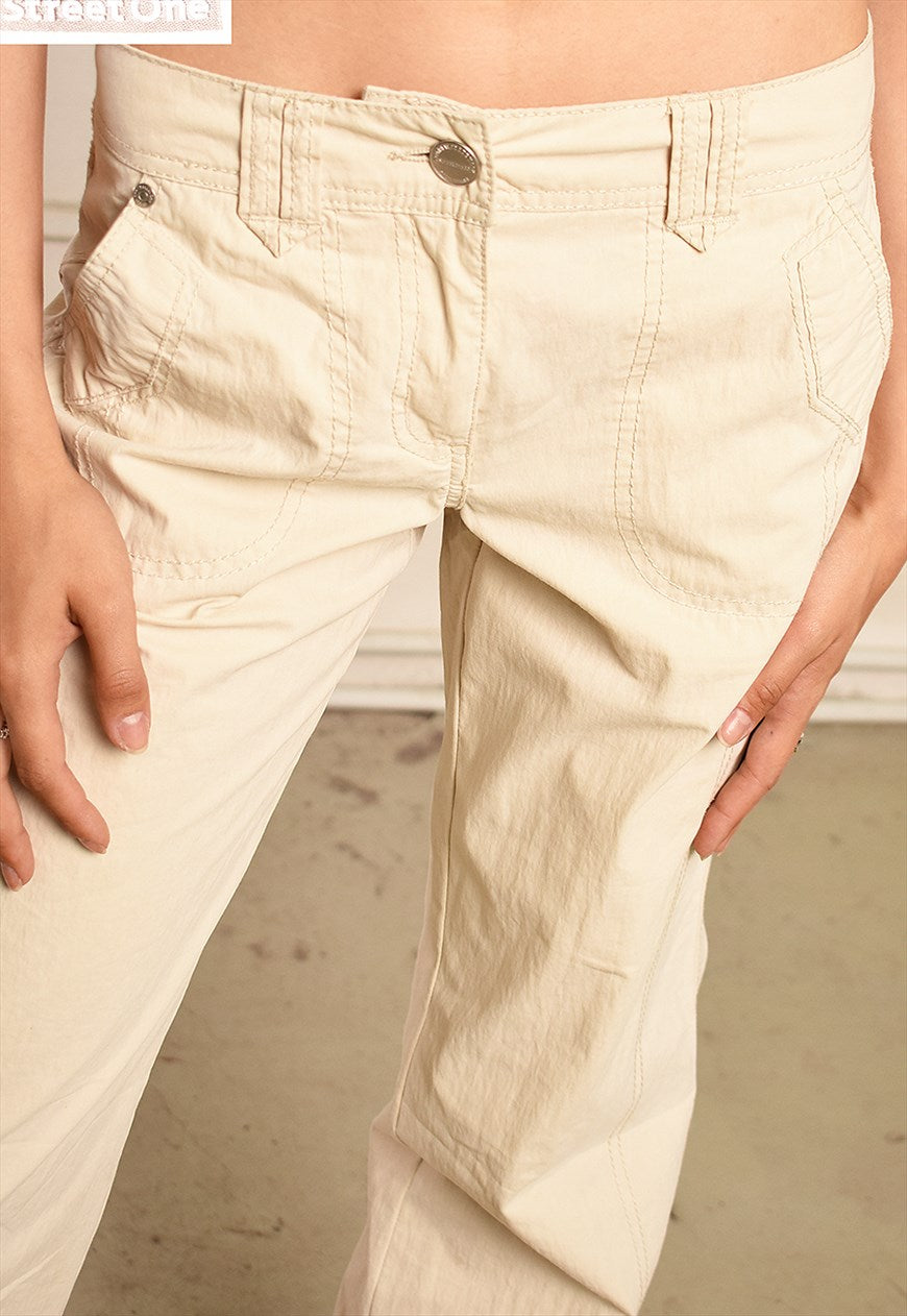 Cool Y2K retro neutral low waist cargo trousers. Button, zipped, pockets, belt loops, great condition. Size fits UK 10. Please see the measurements. The model size is UK 6. Waist - 74 cm, inside leg length - 79 cm. 70% cotton, 30% elastane. Delicate wash. Browse our full collection for other matching items. TR 466